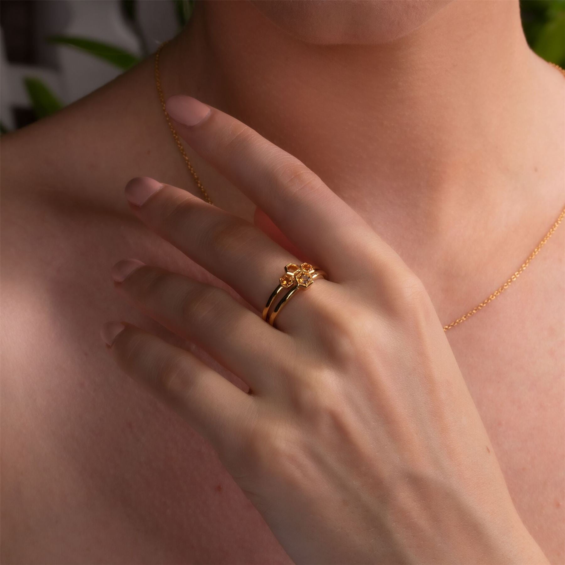 A nature-inspired ring featuring sunny citrine gemstones in honeycomb inspired hexagon settings on a 9ct yellow gold band. Mix and stack this playful band with your jewellery favourites from Gemondo's Honeycomb Inspired Collection.