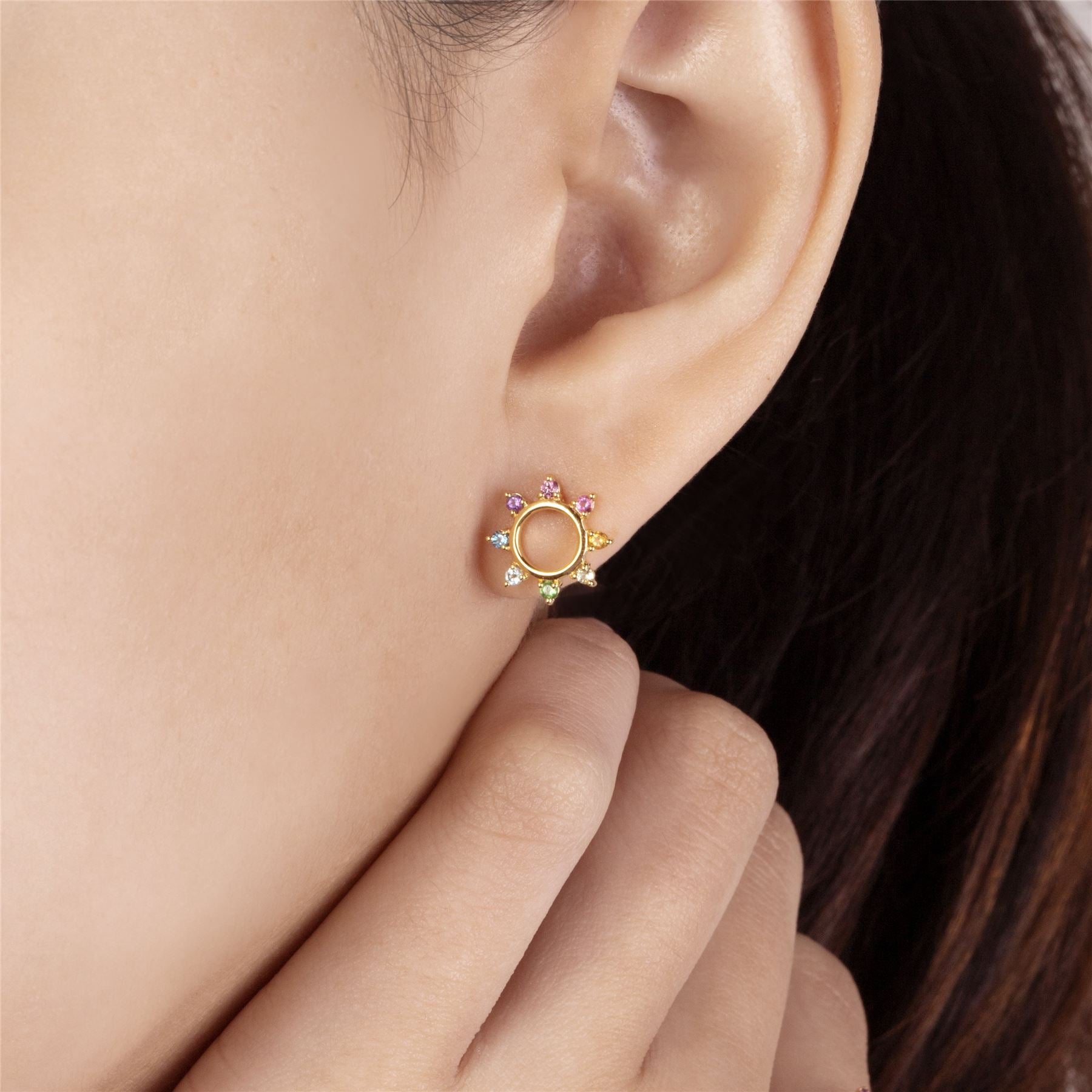 A playful pair of rainbow stud earrings bursting with expressive colour. Set in yellow gold plated sterling silver embellished with pink rhodolite, tourmaline, citrine, peridot, tsavorite, blue topaz and amethyst gemstones, these multicolour earrings are designed to delight. These earrings feature a post and butterfly clip and are suitable for pierced ears.