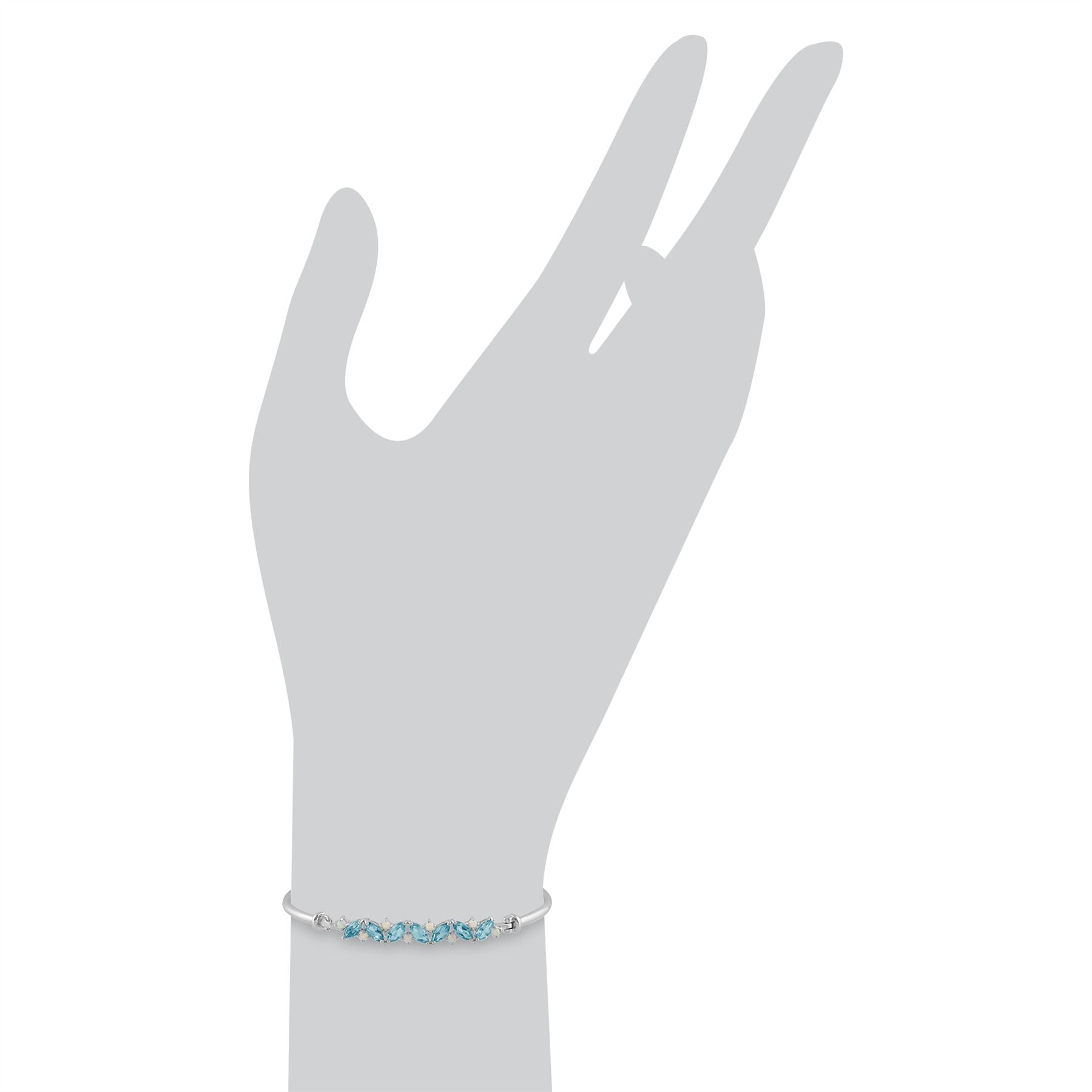This cute and feminine bangle bracelet teams beautifully iridescent white opal cabochons with ice-like marquise cut Topaz gemstones, the birthstones for October and November. Making a stunning 'something blue' for brides or an eye-catching statement to adorn the wrists, this 925 sterling silver bangle for women is a vibrant gift and unique addition to your jewellery collection.