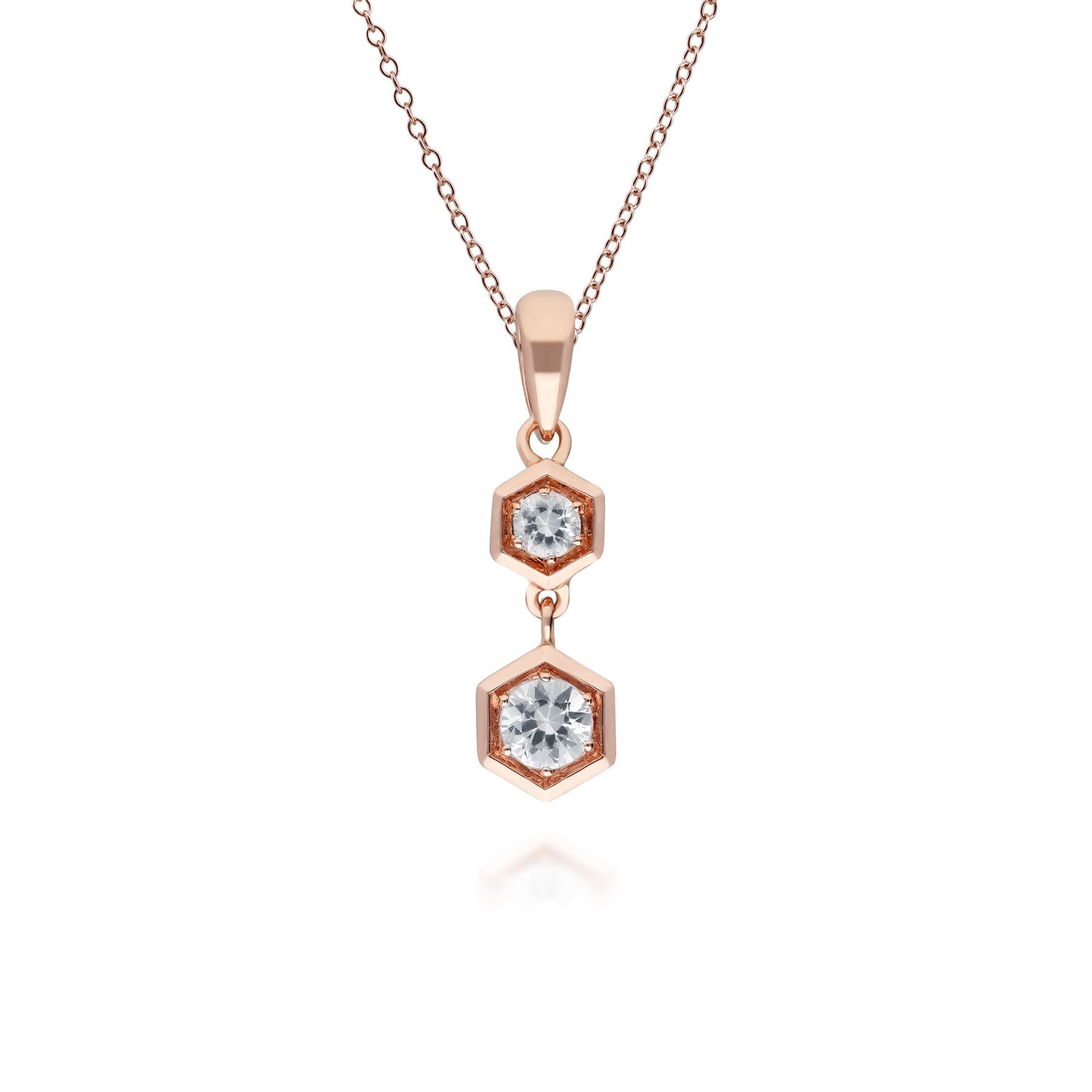 Un pendentif géométrique moderne en or rose 9 carats avec des pierres précieuses de saphir clair étincelant de taille ronde dans des sertissages hexagonaux inspirés des nids d'abeilles sur une chaîne en or rose assortie de 45 cm. Mélangez et empilez ce magnifique collier à pendentif avec vos bijoux préférés de la collection Honeycomb Inspired de Gemondo.