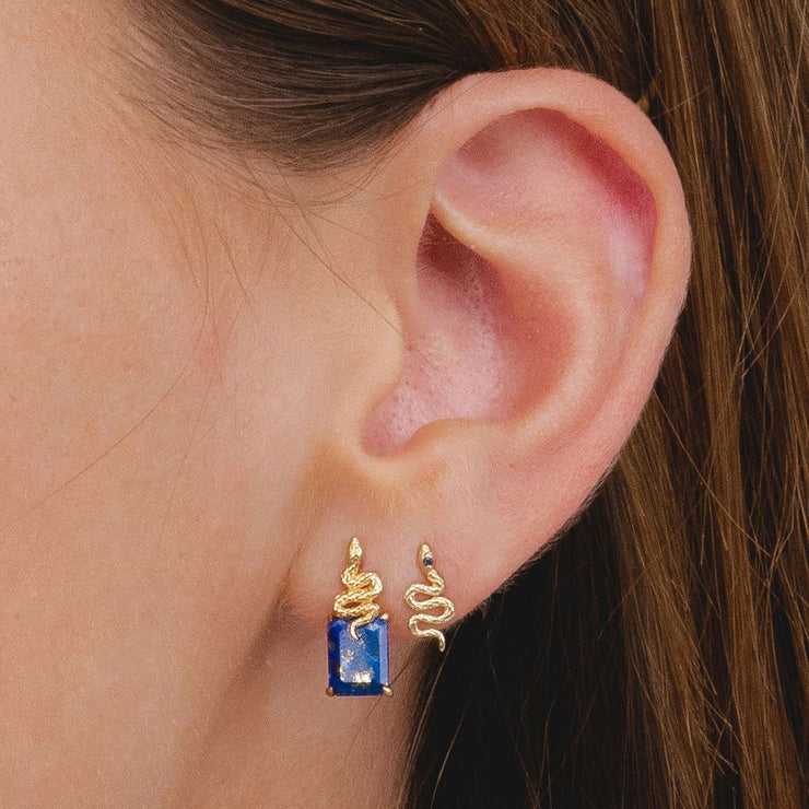 Une belle paire de boucles d'oreilles serpent en or jaune décorées de superbes pierres précieuses de saphir dans un design enveloppant élégant. Ces boucles d'oreilles sont complètes avec une tige et un dos papillon.