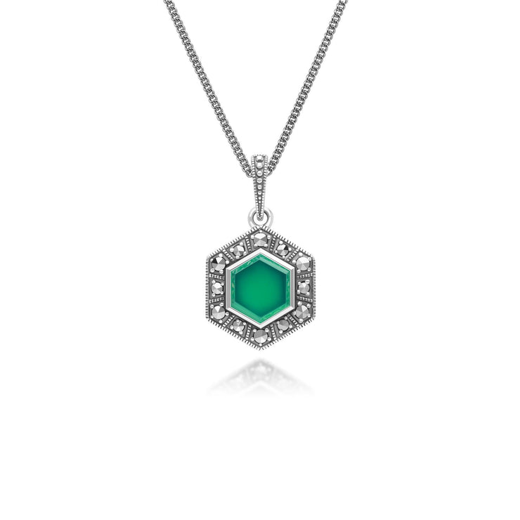 Un collier pendentif intemporel en argent sterling de style Art déco avec une calcédoine hexagonale et une marcassite scintillante.