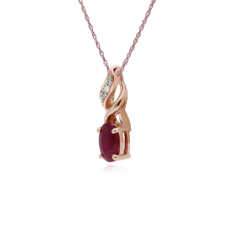A stunning pendant crafted from 9ct rose gold, featuring an oval ruby gemstone decorated with a sparkling diamond.
